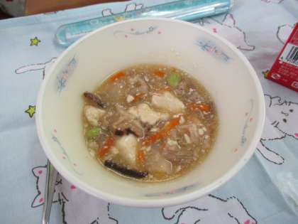 給食の「五目どうふ」には,豚肉,豆腐,干しいたけ,玉ねぎ,人参,