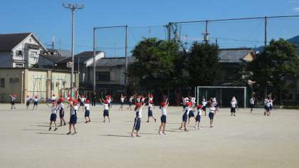 運動場に出てきて,スポーツフェスティバルに向けての練習です。自分が立つ位置についても,目印を頼りに確認します。みんなで頑張っています。