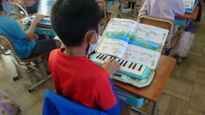 鍵盤ハーモニカで演奏したり,タンバリンやカスタネットを使ってリズム打ちをしたりして,楽しく音楽の時間を過ごしました。