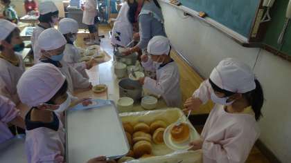 1年生の給食当番も,しっかりと配膳できるようになってきました。何事も経験ですね。