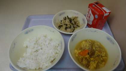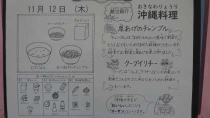 今日の献立は,「麦ごはん・牛乳・厚あげのチャンプル・クーブイリチー」でした。沖縄料理をおいしくいただきました。