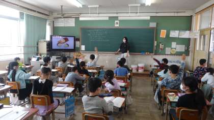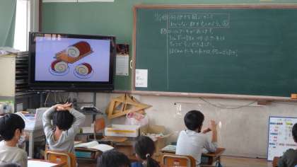 算数の時間の前半の様子です。今日考える問題が最初に提示されます。具体の絵なども提示して,問題場面を把握しやすくしています。