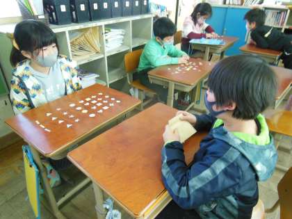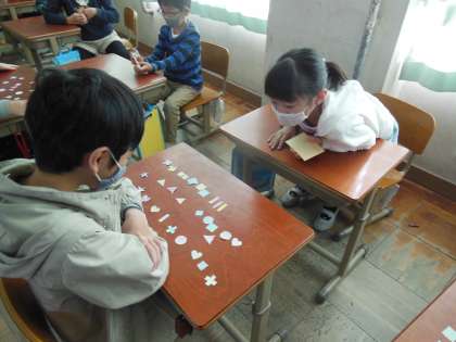 今日は,自分たちで色付けした形をお店屋さん形式でやりとりしました。気持ちを込めて作ったものがどんどんもらわれていくことに喜んでいました。また,「What do you want?」 「Red circle, please.」など英語を使いながらどんどんほしいものを集めていきました。最後には,集めた形を使ってクリスマスカードを作ります。どんなカードになるのか楽しみです。