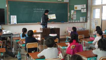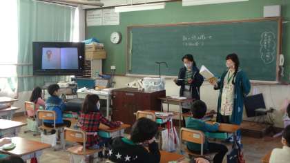 2年生の一つの教室では,絵本の挿絵を大型テレビに映し出しながら読み聞かせをしていただきました。