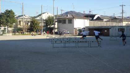ハードル走の学習です。友だちと競い合いながら自分の記録に挑戦しています。