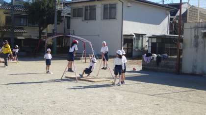 体育のてつぼうあそびの様子です。いろいろなことができるようになってきています。