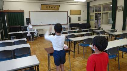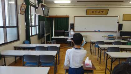 今日から身体計測・視力検査が行われています。保健室の先生と一緒に,計測・検査を受けています。写真は2年生の視力検査の様子です。