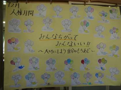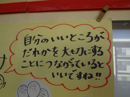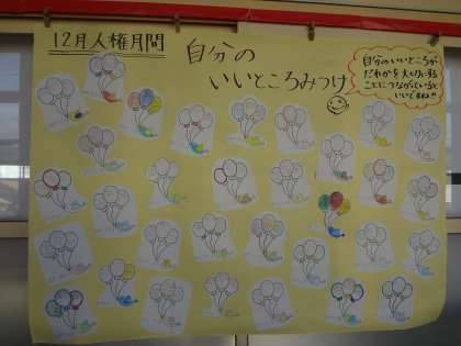 先日の人権学習では,「人権」について考えました。その時に,自分のいいところを見てけて交流し合いました。〜自分のいいところがだれかを大切にすることにつながっているといいね!〜という気持ちをこめて,お互いの意見を学年のろうかで交流し合っています。