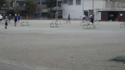 ハードル走の学習です。低くまたぎ越しながら走り抜けるイメージをつかむために,ミニハードルも活用しています。