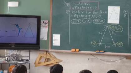 図形の学習です。今日は二等辺三角形をかく際には,コンパスをどのように活用したらいいか考えました。