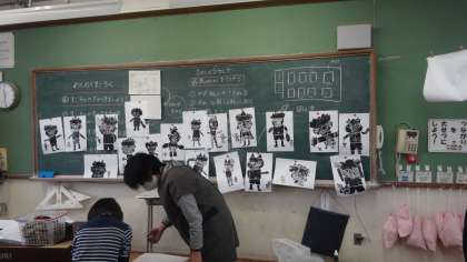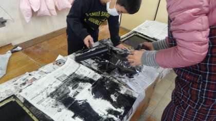 2年生は紙版画に挑戦です。紙を貼り合わせて思い思いの版ができ,インクを付けて刷っていきました。力作が出来上がっています。