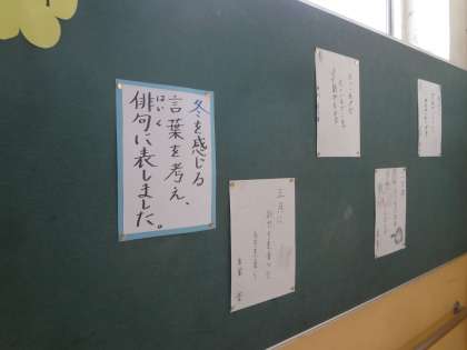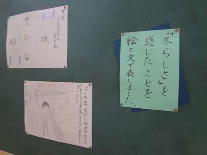 国語科では,冬を感じたことについて,文にしたり俳句にしたりして冬を感じる言葉をあつめました。教室に掲示した廊下に掲示して,みなで交流しています。まだまだ一段と寒さが厳しくなりますが,みんなで楽しく乗り切れるといいですね。