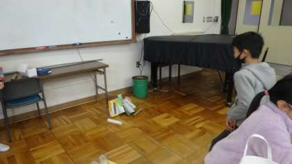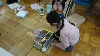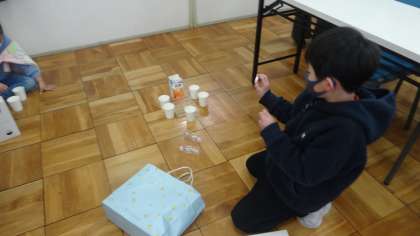 いろいろなものを持ち寄って,おもちゃ作りに取り組みます。それぞれが持っているものでどんな楽しみ方ができるか,実際に体験しながら調べています。