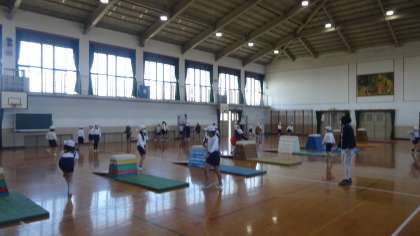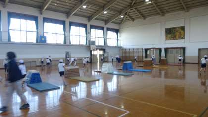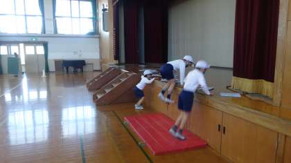とび箱と運動の学習の様子です。踏み切った時に腰を高く上げることを意識しています。体ならしの時間も大切にして,大きく跳ぶことができるように頑張っている3年生です。