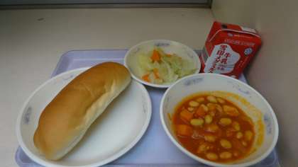 今日の献立は,「コッペパン(国内産小麦100%)・牛乳・大豆と鶏肉のトマト煮・野菜のホットマリネ」でした。野菜のホットマリネは,野菜の歯ごたえを感じながら,さっぱりと美味しくいただきました。