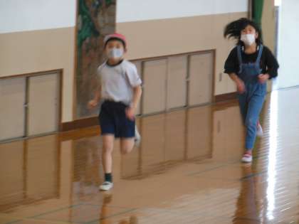 「めざせ300km!下小マラソン」の取組でみんな一緒に走っています。時間内できるだけ走り続けられるように走っていました。