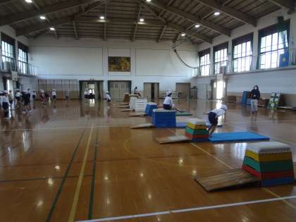 単元「とびばこ」では,自分のめあてにそってねらいを決めて学習を進めてきました。ねらい1では,自分ができる技を繰り返し練習してよりきれいにとべる練習をしています。ねらい2では,できない技を練習しています。とびばこの位置や置き方を工夫して練習の場をつくり,練習に励みました。