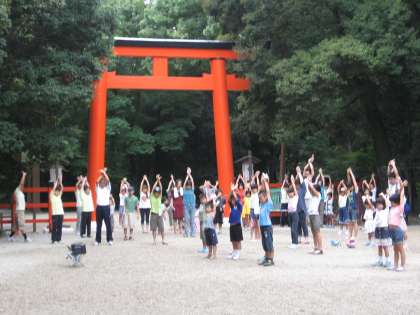 7月23日(土)から下鴨神社 糺ノ森で,下鴨体育振興会主催のラジオ体操が毎朝午前6時30分に行われています。夏休みに入っても,規則正しい生活ができるように,たくさんの子どもたちが参加しています。また,地域・保護者の方々も多数参加されています。7月31日まで続けられますので,朝一番 一緒に気持ちよく体操をしましょう。  8月22日(月)〜8月26日(金)は,下鴨PTA主催のラジオ体操が,下鴨小学校 運動場で行われます。こちらも,多数の参加をお待ちしております。