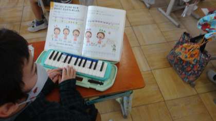 鍵盤ハーモニカの練習です。新型コロナウイルス感染拡大防止のため,教室では音を出さずに,指の運びを確認しています。週末に鍵盤ハーモニカを家に持ち帰りますので,お家で音を出しての練習をしていただけたら幸いです