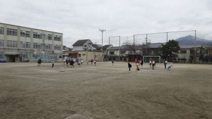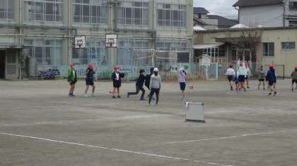 エンドボールの学習の様子です。一生懸命プレーするとともに,自分たちで時計係や得点係も務めながら学習を進めています。