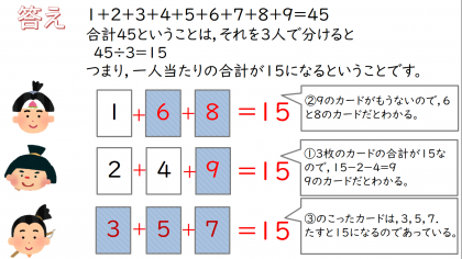 きんたろうは,2+4+□=15なので,9が入り,