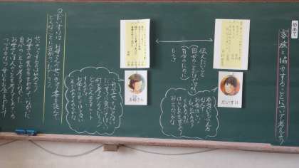 「お母さんのせいきゅう書」という読み物資料を読んで,家族と協力することについて考えました。自分自身の体験も踏まえながら,みんなで意見交流をしました。