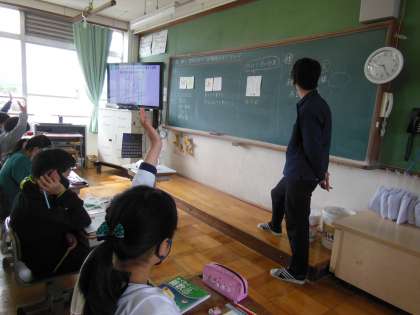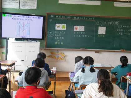 今日の学習は線対称について学習しました。形の特徴や対応する点を考え,気づいたことをどんどん発表していました。