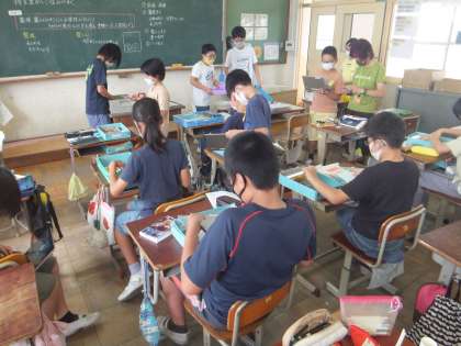 家庭科「物を生かして住みやすく」の学習の様子です。整理整頓の仕方を確認した後,実際にお道具箱を整理整頓しました。整理する前の道具箱を写真に撮り,整理後と比べながら工夫したところをまとめました。よく使うものは手前に置いたり,係などで使うものはロッカーに置いておいたりするなど,工夫して整理整頓する姿が見られました。