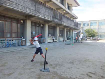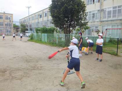 5年体育科「ベースボール」の学習の様子です。毎回の学習でめあてをもって取り組んでいます。はじめはボールを遠くに飛ばすことができなかった子どもたちも,学習の中で,友達にアドバイスをもらったり,上手い友達の打ち方を見て真似をしたりして,最後の試合の時には,ボールをよく見て打ち,遠くに飛ばせるようになりました。チームで協力することはもちろんのこと,相手チームにも温かい声掛けをしている姿も見られました。