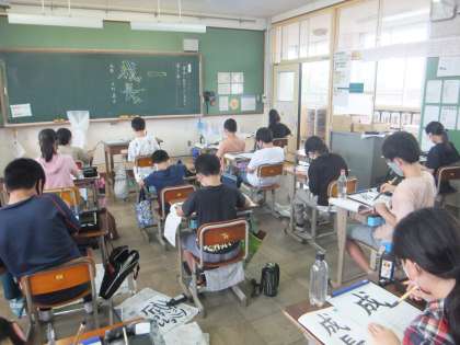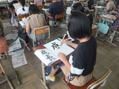2学期初めての毛筆の学習です。「筆順に気を付けて,字形を整えて書こう。」というめあてのもと,「成長」という文字を書きました。漢字2字でバランスをとるのが難しいと言っている子どももいましたが,一画一画ていねいに,集中して書くことができました。