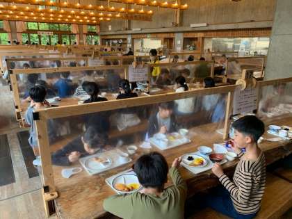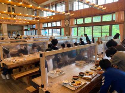 朝からしっかり食べて、この後の火おこしや野外炊事に協力して取り組んでいきます。