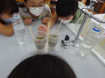 単元「雨水のゆくえ」では,「水は,地面にしみこむのだろうか。」というめあてで学習をすすめました。校庭のすなと砂場の土についての水のしみこみ具合の違いについて調べました。