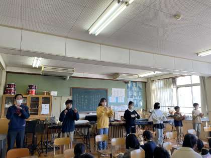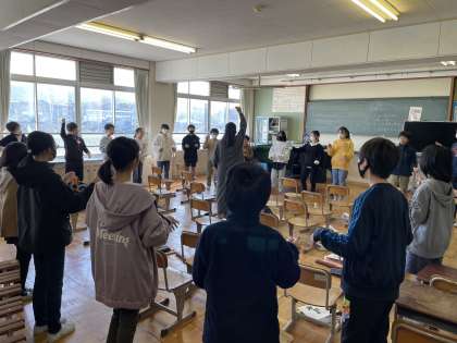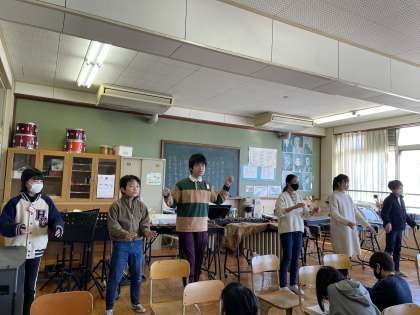 音楽のテストで、ブラームスの「ハンガリー舞曲」に合わせて指揮をしました。ブラームスのことを学習した後、曲調に合わせて指揮を振りました。強弱や抑揚を考えながら堂々と指揮することができていました。
