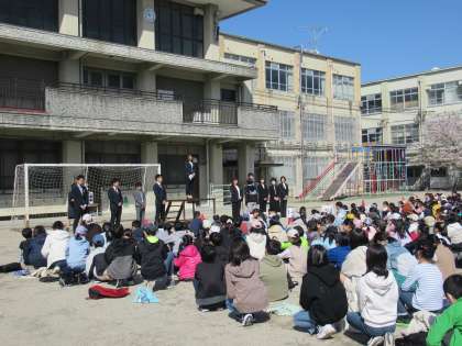 13名の新着任の教職員をお迎えして、令和6年度がスタートしました。桜がきれいに咲きほこり、きれいな青空の下、着任式・始業式を行うことができました。新着任の先生方をお迎えするにあたり、新6年生が立派にお迎えの言葉を述べてくれました。