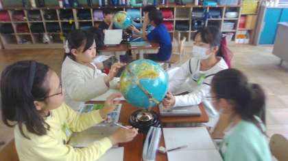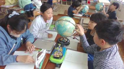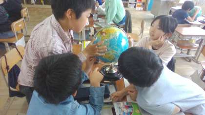 「線がたくさんある。」「この線は何だろう。」「海の部分が多い。」「陸地の色が違うところがある。」など楽しく交流する姿が素敵でした。