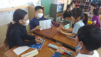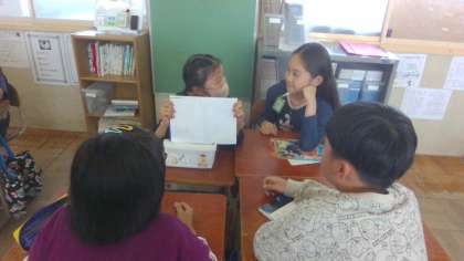 国語科「ひみつの言葉を引き出そう」の学習をしました。1人だけ知らされていないひみつの言葉を自然と口にするように、グループ全員で会話しました。ひみつの言葉がなかなか出なくて苦戦しているときもありましたが、楽しそうに活動していました。