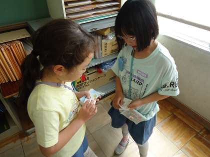 Unit1では、世界のいろいろな国のあいさつを知るとともに、友だちと英語であいさつをしたり名前を伝えたりする活動をしました。今日は、友だちとあいさつしながら自分の名前が書いてある名刺カードを交換しました。相手に伝わる工夫にはどんなことがあるかを考えながらやりとりを楽しんでいました。