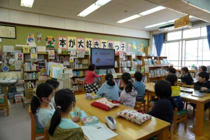 学校司書の先生に、図書館の使い方について教えていただきました。図書館にはどんな本があるかや、公共図書館との違いも知ることができました。本が好きな子ども達は、興味をもって、先生の話を聞いていました。