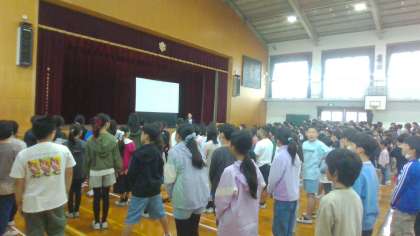 次に、校長先生から、1年後の自分がうんと成長しているようにどのように学習していけばいいかというお話をしていただきました。しっかりと自分の考えを声に出すことで頭の中が整理されたり考えられたりすること。伝えたい思いをもって発表することでできることを増やすことになるというお話でした。