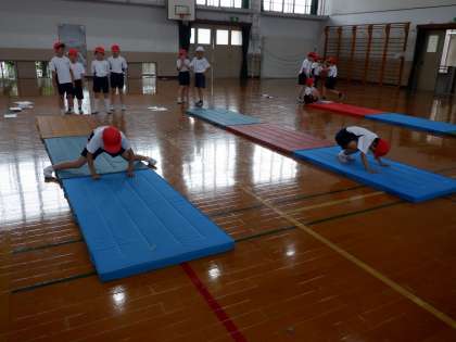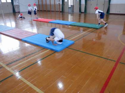 体育科で「マット運動」の学習をしていますが、学習も後半になり、自分のできる技で続けたり、組み合わせたりする運動に挑戦しています。