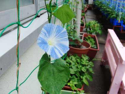 今年も北校舎沿いに緑のカーテンを行っています。今年は「西洋朝顔」の品種を取り入れて育てています。西洋朝顔はとても成長が早く,どの品種よりも早く花を咲かせてくれました。