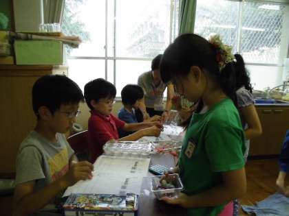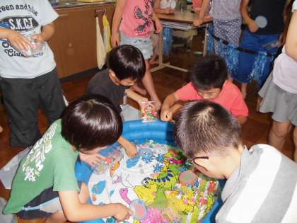 なずな学級の屋台「金魚すくい大会」に、3年生が招待してもらいました。なずな学級の3名のお友だちが大会の司会進行をして、グループ対抗で金魚すくいをしました。みんな必死で金魚をすくい、なずな学級のお友だちと大いに盛り上がり、楽しく交流ができました。