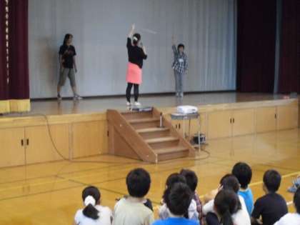 休み時間に楽しく体を動かしてもらおうと,先生たちから遊びの紹介をしています。。今回は「ゴムとび」です。昔からある遊びですが,やったことのない児童もたくさんいるようです。先生が実際にやってみて,さまざまなテクニック?を披露しました。中には高度な技を持つ先生もいましたので,ぜひ伝授してもらってほしいです。