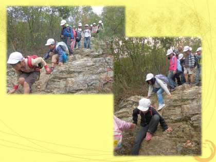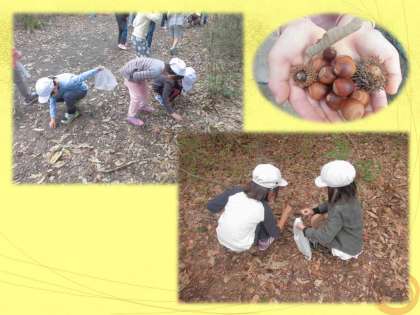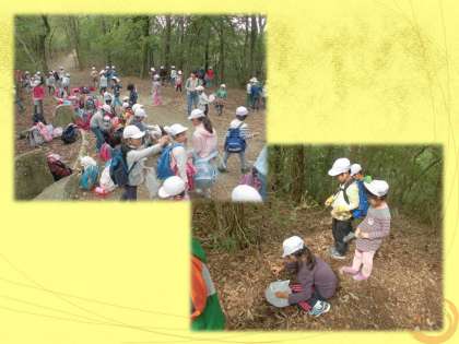 無事に登り切ってほっと一息休憩。さすが2年生,今年はみんな余裕を感じられました。休憩場所では,ドングリなどの木の実を拾ったり,コオロギを捕まえたりして楽しんでいました。下り道にも急な場所がありましたが,1年生を気遣いながらしっかりとした足取りで歩くことができていました。