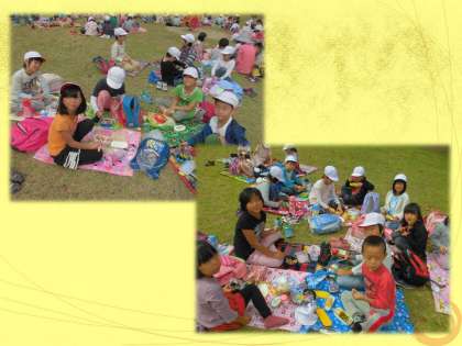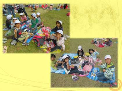 子どもの楽園に到着したらさっそくお昼ご飯にしました。みんなが楽しみにしていたお弁当を広げ,とてもおいしそうに食べていました。