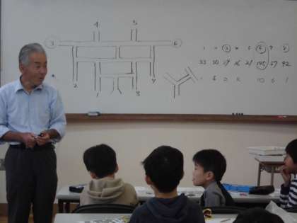 成田先生による授業「わくわくチャレンジ」を開きました。今回は「ダンゴムシは左右が分かるだろうか?」というタイトルです。迷路をつくってそこにダンゴムシを通らせ,どのように進むのかを観察しました。ダンゴムシの「交替性転向行動」を見る実験ですが,実際にそのように進むダンゴムシばかりではないのが,実験の面白いところです。みんなで何度も繰り返し,統計をとって比べてみました。また,他の虫でも試してほしいとおみます。