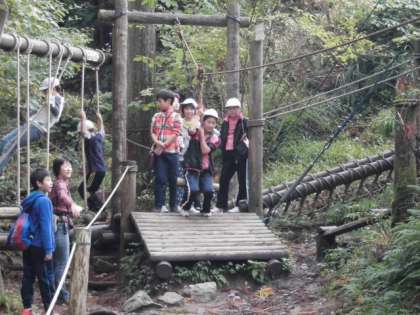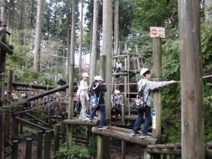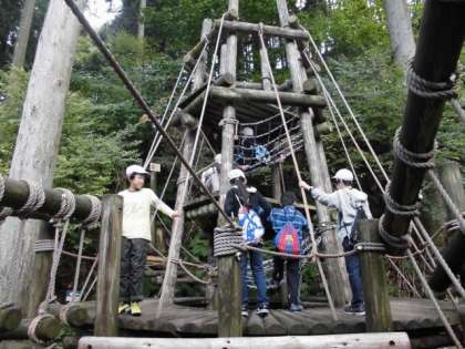 山の家の名物フィールドアスレチック「冒険の森」で楽しんでいます。難度は関西最大級?の呼び声が高く大変面白いです。みんなターザンロープなど、何度も繰り返し遊んでいます。