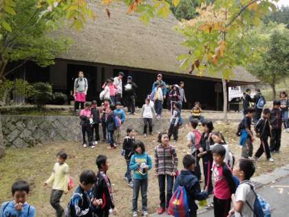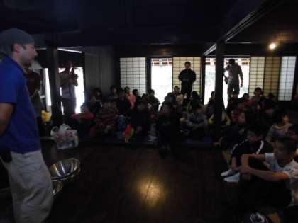 江戸時代から京都広河原で使われていた古民家を山の家に移築した建物です。今日はここでお餅つきです。部屋の真ん中に大きなかまどがあります。寒い地方ではこのように暖をとっていたのですね。