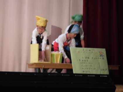 なずな学級の演目は「なずな学級のタイムトラベル」です。タイムマシンに乗って今までの行事を振り返って,演技をしました。最後は音楽部と合同でサンバのリズムを演奏しました。