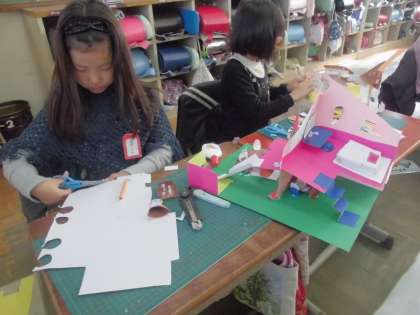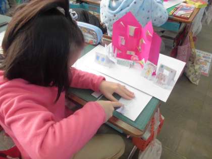 図工では,厚紙で家を作り,そこにいろいろな形や開け方の窓を作り,窓の中に見えるものを工夫してきました。今日は,家の周りに車や人など情景を表すものを作りました。すべり台があったり,ブランコがあったりと,子どもたちの夢の家ができあがりました。